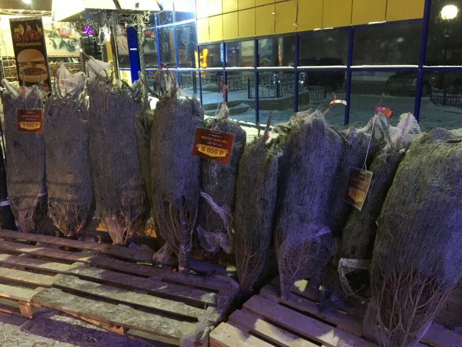 Сосны до 1,5 метров стоят 600 рублей, до 2-х метров — 900 рублей, все, что выше — 1200 рублей. На ели ценник в районе 1000-1500 рублей. Кстати, елки можно найти и в центре — на малом базаре по Кирова, 12/1, возле острога. Они тоже от Якутлесресурса, прибыли из Алдана.