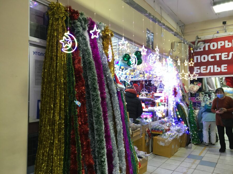 Будним днем на рынке уже многолюдно. Спрашиваем у продавца, как идет торговля. Нам отвечают, что изменений по сравнению с предыдущими годами — никаких. Новогодние товары расходятся на ура.