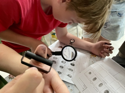 Сотрудник отдела криминалистики рассказал ребятам о задачах и функциях дактилоскопических инструментов, которые используют следователи СК России в своей работе. Дети смогли не только посмотреть на процедуру снятия отпечатков пальцев, но и сами поучаствовали в ней. Некоторые забрали карты с черными паутинками своих пальцев себе на память.