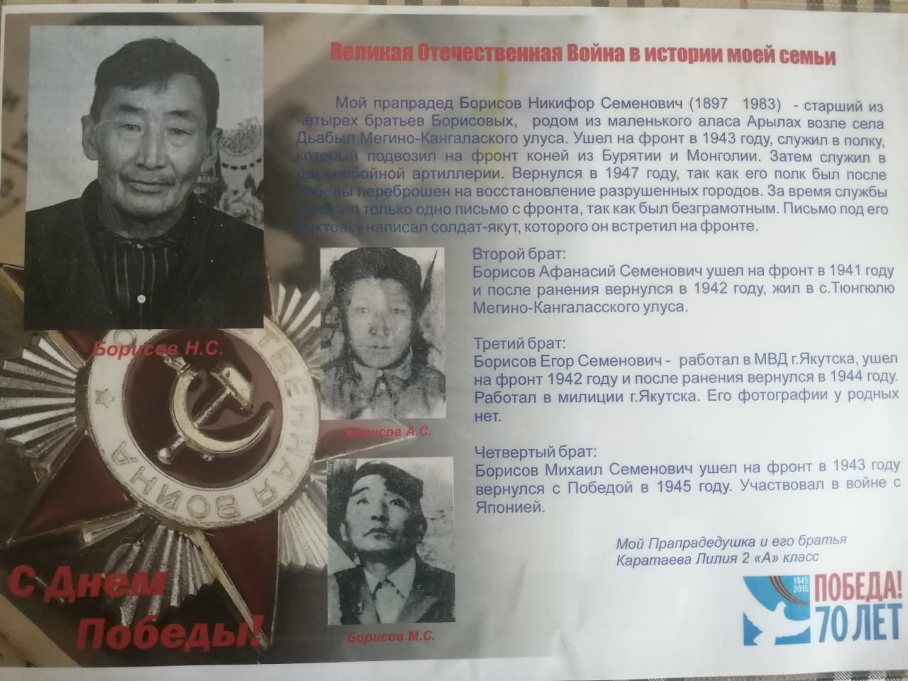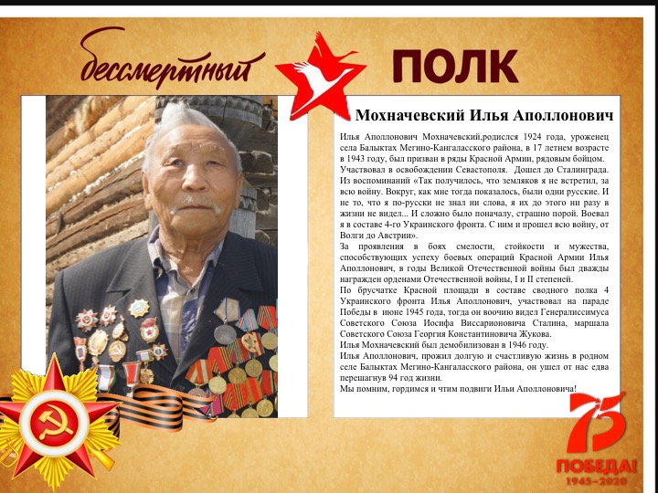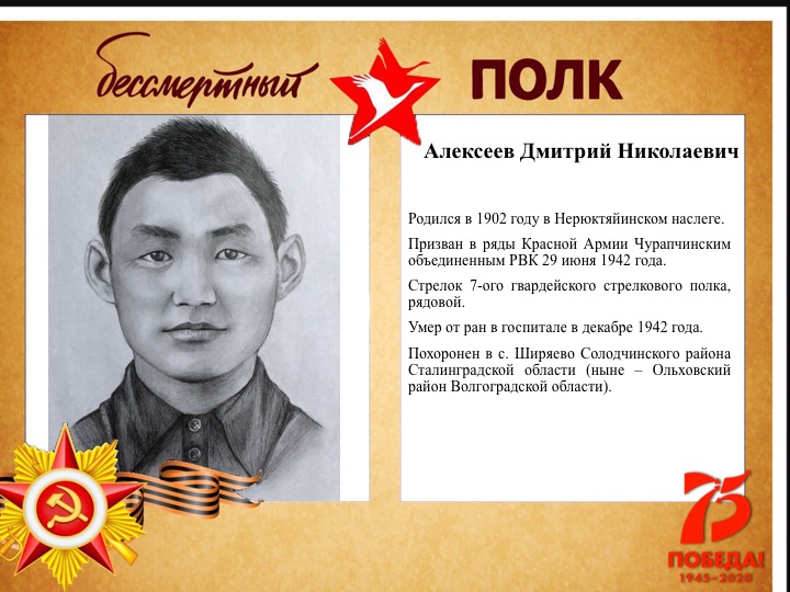 На фронт из Якутии ушли около 65 тысяч молодых ребят, мужчин, из которых живыми вернулись 28 тысяч. Не стоит забывать и о тружениках тыла, внесших ощутимый вклад в дело Победы. Многие уже в преддверии праздника начали выкладывать в социальных сетях фотографии своих героев, подаривших мир и свободу многим народам, а некоторые отправляли снимки в наше агентство. ЯСИА предоставило жителям республики свою площадку, чтобы память о воинах-якутянах сохранилась на века и передавалась из поколения в поколение. Представляем вам большую фотоподборку из городов и районов Якутии.