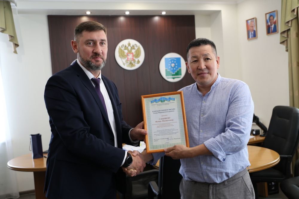 И.о. главы администрации Мирнинского раойна Дмитрий Ширинский вручил благодарственное письмо начальнику отделения лицензионно-разрешительной работы по Мирнинскому району Управления Росгвардии по Республике Саха (Якутия), майору полиции Федору Габышеву.