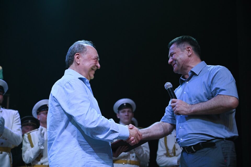 Председатель правительства республики Андрей Тарасенко поблагодарил Приморский театр за успешные гастроли, вручил художественному руководителю театра Ефиму Звеняцкому благодарственное письмо правительства Якутии, а также юбилейные знаки 100-летия образования ЯАССР народному артисту России Владимиру Сергиякову и народному артисту России Александру Славскому.