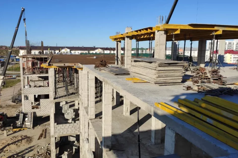 На объекте 18 специалистов выполняют широкий спектр работ: благоустройство прилегающей территории, монтаж инженерных систем, включая каркас насосной станции и трубы отопления, а также внутреннюю отделку помещений и гидроизоляцию кровли.