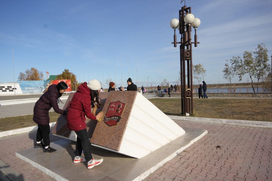 Студенты Северо-Восточного федерального университета и сотрудники управления молодежи и семейной политики Якутска провели уборку, отмыли и покрасили памятники, мемориальные таблички, отреставрировали и покрасили бордюры на площади Победы.