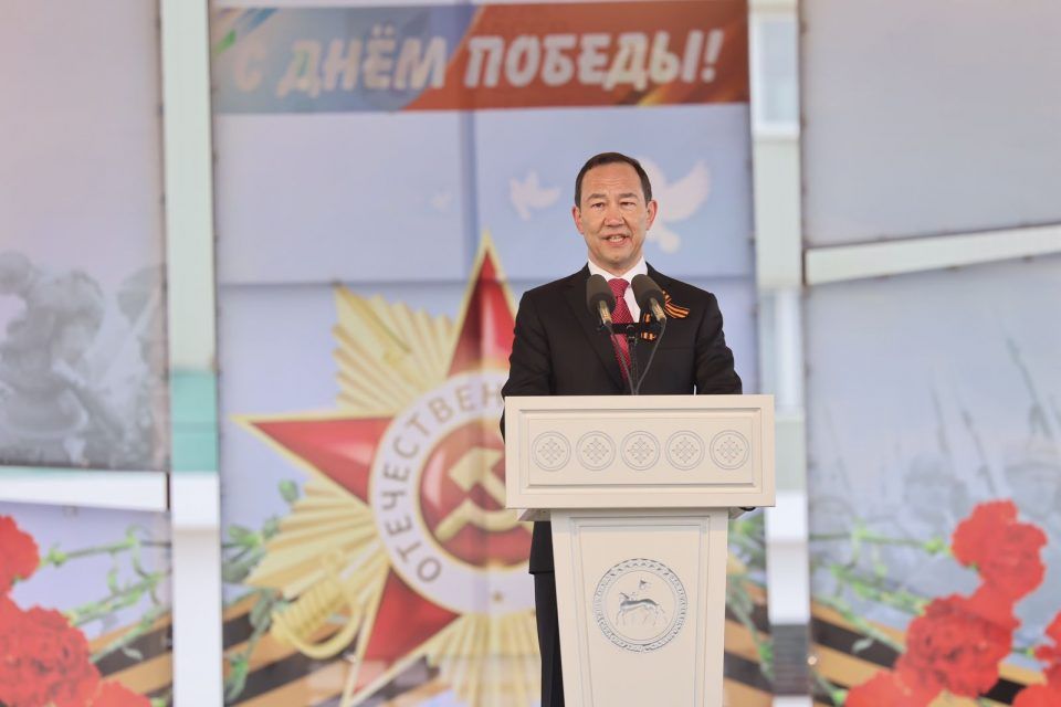 «Ровно 79 лет назад многонациональный советский народ одержал Победу в долгой, разрушительной и самой кровопролитной в истории человечества войне. Якутия вместе со всей страной и всеми силами боролась за победу. Из наших городов и сел отправились на фронт свыше 62 тысяч якутян. Более половина из них — 38 тысяч воинов погибли смертью храбрых на полях сражений. А в тылу, в далекой Якутии, каждый приближал Победу своим героическим трудом, ценой огромных лишений, ценой жизни тысяч людей. Все годы войны Якутия была надежной опорой для фронта. На нужды фронта наши земляки отправляли золото, олово, уголь, лес, продукты питания. Все жили под единым лозунгом «Все для фронта, все для Победы». Всеобщий самоотверженный труд якутян во время Великой Отечественной войны признан на самом высоком уровне. Двум нашим городам — Якутску и Алдану указом президента страны Владимира Путина присвоено звание «Город трудовой доблести». Мы гордимся и склоняем свои головы перед трудовым подвигом якутян и мы по сей день достойно продолжая традиции старших поколений своим трудом наращиваем силу всей России», — сказал Айсен Николаев.