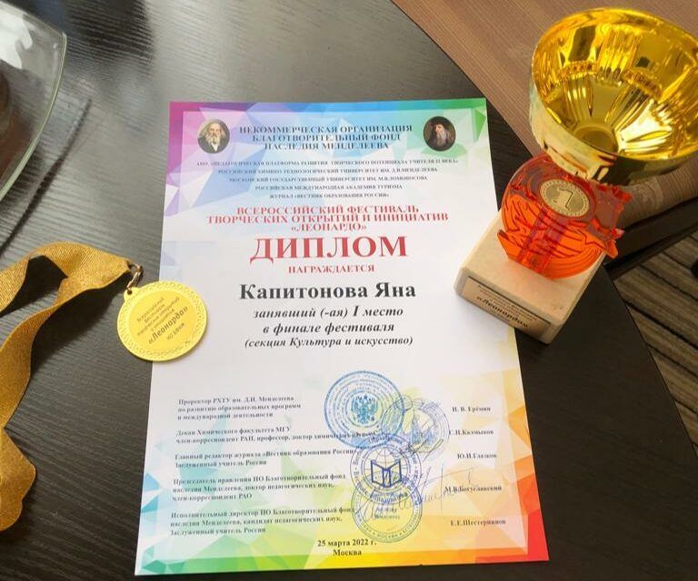 В конце марта в Москве прошел финальный этап Всероссийского фестиваля творческих открытий и инициатив «Леонардо». Фестиваль организован Фондом наследия Менделеева, рядом крупных университетов Москвы при участии журнала «Вестник образования России» и при поддержке Министерства образования и науки РФ. В этом году в мероприятии в очной форме приняло участие 600 школьников из всех регионов страны, прошедших отбор оргкомитета фестиваля «Леонардо». Они представили свои научные исследования в 13 секциях. Яна Капитонова, ученица 10 класса Хатасской школы им. П.Н. и Н.Е. Самсоновых Якутска, завоевала золотую медаль в секции «Культура и искусство».