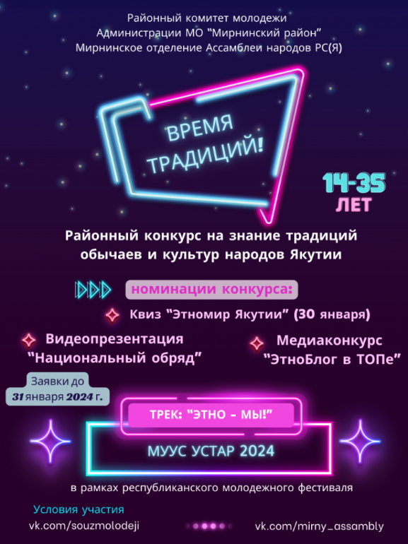 Скорее читай условия районного конкурса «Время традиций» в рамках республиканского молодежного фестиваля «МУУС Устар».