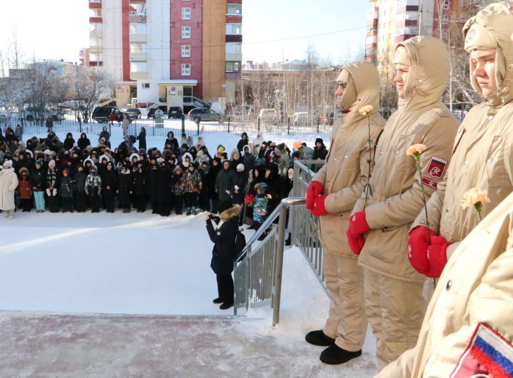 На митинг пришли школьники, педагоги образовательных учреждений района, горожане, руководители муниципалитетов и акционерной компании. Открыли доску первый заместитель главы администрации Мирнинского района и супруга героя,