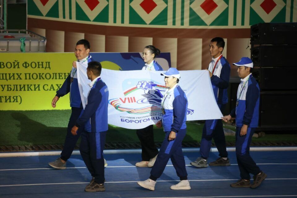 Получить флаг на сцену вышла делегация Нюрбинского улуса во главе с председателем районного совета депутатов Сергеем Евсеевым. В передаче флага приняли участие именитые нюрбинские спортсмены, а также чемпионы и призеры нынешних игр в Борогонцах.