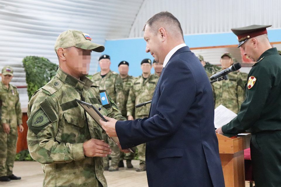 Также руководитель департамента внутренней политики администрации главы и правительства Якутии Александр Трофимов вручил знак отличия «Гражданская доблесть» заместителю начальника СОБР «Алмаз» и от имени Ил Дархана передал спецназовцам Росгвардии, вернувшимся из служебной командировки, якутские ножи.