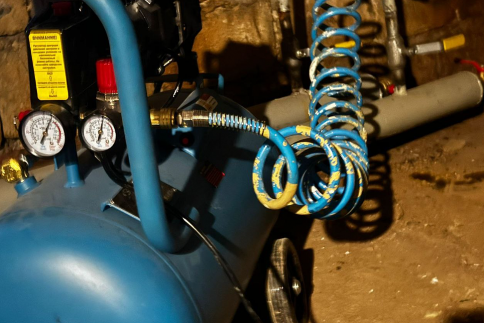 После окончания капитального ремонта специалисты Фонда совместно с подрядной организацией проводят обязательные работы по опрессовке системы отопления. К узлу ввода многоквартирного дома подключается воздушный компрессор, который создает давление в системе и позволяет выявить возможные недостатки заранее.