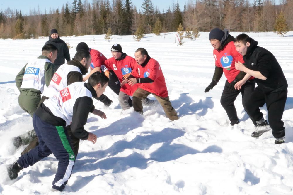 Ну и любимый всеми финал – командный хапсагай. Борьба проходит на снежной целине. Если сначала бой распадается на отдельные схватки, то завершается он коллективной атакой. Воткнули соперника головой в сугроб и под одобрительные крики победители вскидывают руки. В итоге, победителем соревнований стали ребята из КСК «АЛРОСА». Победителю достался сертификат на 70 тысяч рублей. На втором месте команда МЧС (команда отмечена сертификатом на 50 тысяч). А замкнули тройку призеров местные парни из РОМН «Барагат» (сертификат на сумму – 30 тысяч рублей). Призов было множество: сертификаты, ценные подарки.