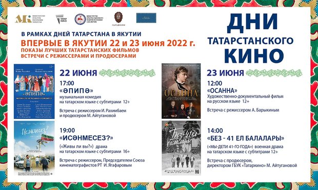 В кинотеатре «Лена» 22 июня состоится показ музыкальной комедии «Апипа» и драмы Ильдара Ягафарова «Исәнмесез», завоевавшей на XVII Казанском международном фестивале мусульманского кино приз президента Татарстана «За гуманизм в киноискусстве» и приз зрительских симпатий. Якутские зрители 23 июня смогут посмотреть художественно-документальный фильм «Осанна» Алексея Барыкина и художественный фильм «Мы — дети 41-го года» Амира Галиаскарова.