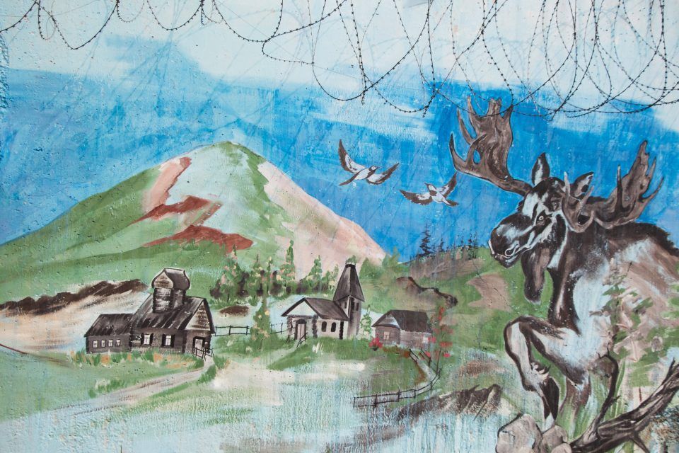 На рисунке изображены природа Севера и покровитель охотников в якутской мифологии Байанай. Осужденный создавал мурал в течение лета под руководством сотрудников колонии на занятиях кружка изобразительного искусства.