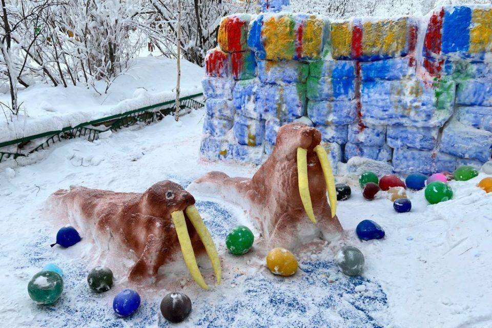 Вся работа по зимнему оформлению территории детского сада проводилась силами его сотрудников. В -45 воспитатели мастерили снежные фигуры, а затем раскрашивали их цветными красками. Так во дворе появился Северный ледовитый океан с его обитателями. На берегу у своего чума сидели оленеводы, а приезжий геолог с заиндевелой бородой разбирался в документах.
