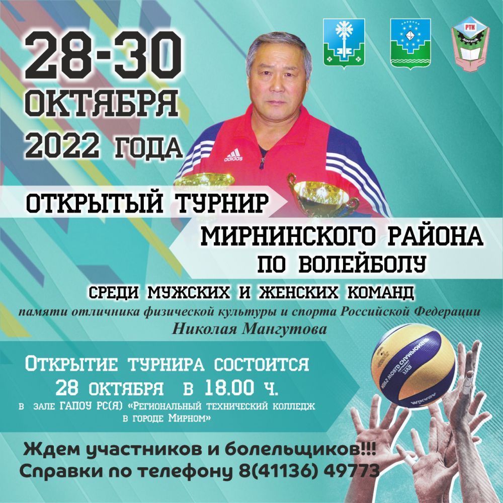 С 28 по 30 октября в алмазной столице состоится открытый турнир Мирнинского района по волейболу среди мужских и женских команд памяти отличника физической культуры и спорта Российской Федерации Николая Мангутова.