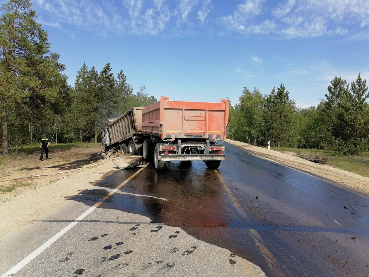 По предварительным данным установлено, что водитель автомашины «Тойота Премио», следуя в сторону Якутска, выехал на встречную полосу движения и совершил столкновение с автомобилем «Скания», который ехал с прицепом, груженым щебнем. После ДТП произошло возгорание большегруза.