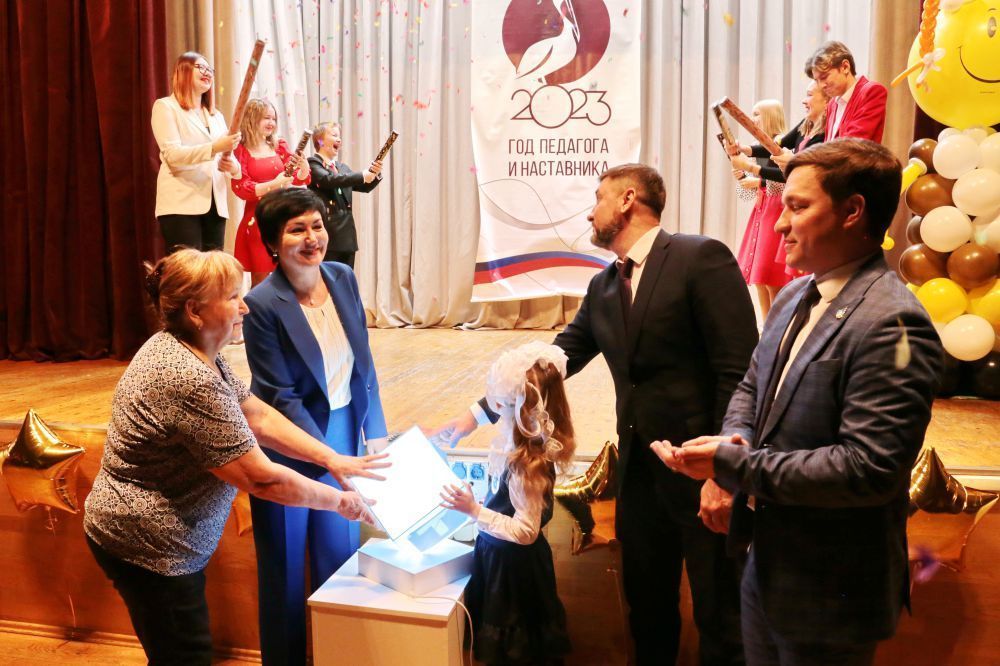 Алексей Солдаткин, Елена Миронова и Дмитрий Ширинский. По команде зала куб загорелся, под гром хлопушек на сцене развернулся баннер с символикой объявленного года. А далее началась церемония награждения наших педагогов республиканскими и федеральными знаками отличия и званиями.