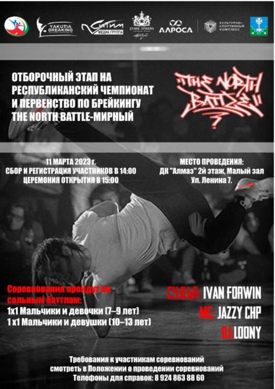 В целях популяризации и развития спортивного направления «Брейкинг», официально признанного Олимпийской танцевальной категорией, 11 марта в городе Мирный состоятся мастер-класс и соревнования по танцевальному спорту в направлении «брейкинг» (брейк-данс).