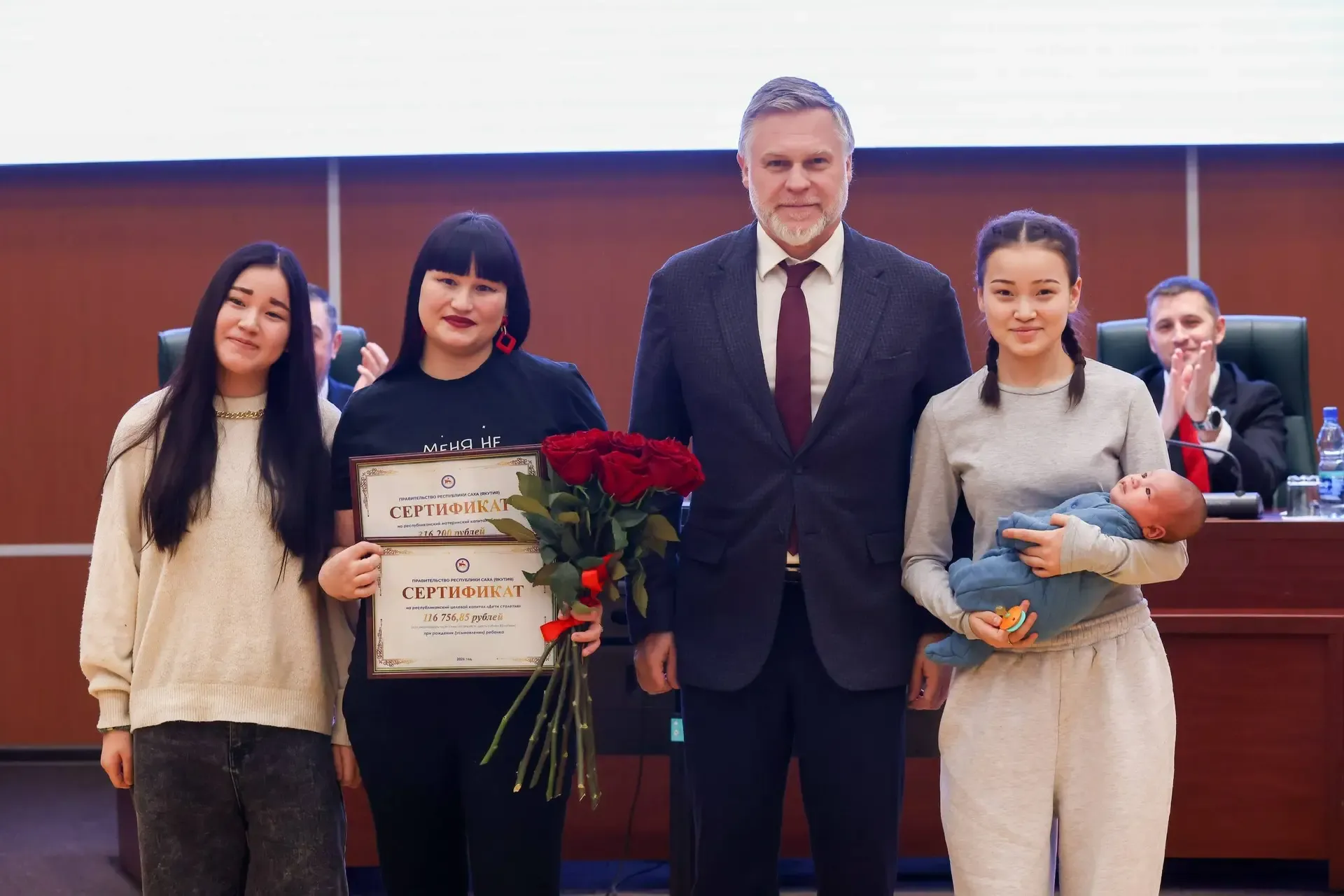 В Нерюнгри во время отчёта правительства Якутии председатель правительства Кирилл Бычков передал двум семьям Нерюнгринского района сертификаты целевого капитала «Дети Столетия» и республиканского материнского капитала «Семья».