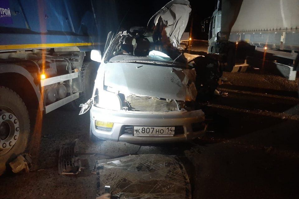 ДТП произошло 20 сентября в районе 22.00 (16.00 мск) на 8-м километре автодороги «Лена» в Сковородинском муниципальном округе. По предварительной информации, водитель автомобиля Toyota Lite Ace Noah, мужчина 1978 года рождения, столкнулся с двумя автомобилями Volvo (самосвал и тягач). Один из грузовиков двигался по полосе встречного движения, а второй поворачивал налево.