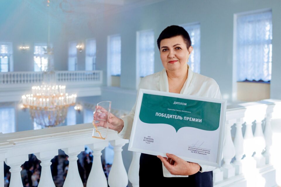 На награждении она получила статуэтку и сертификат победителя. Подготовленный ею для конкурса план урока был посвящён сравнению трёх известных памятников — Петру I, Николаю I и Александру III, сообщает пресс-служба Фонда им. Н. П. Румянцева.