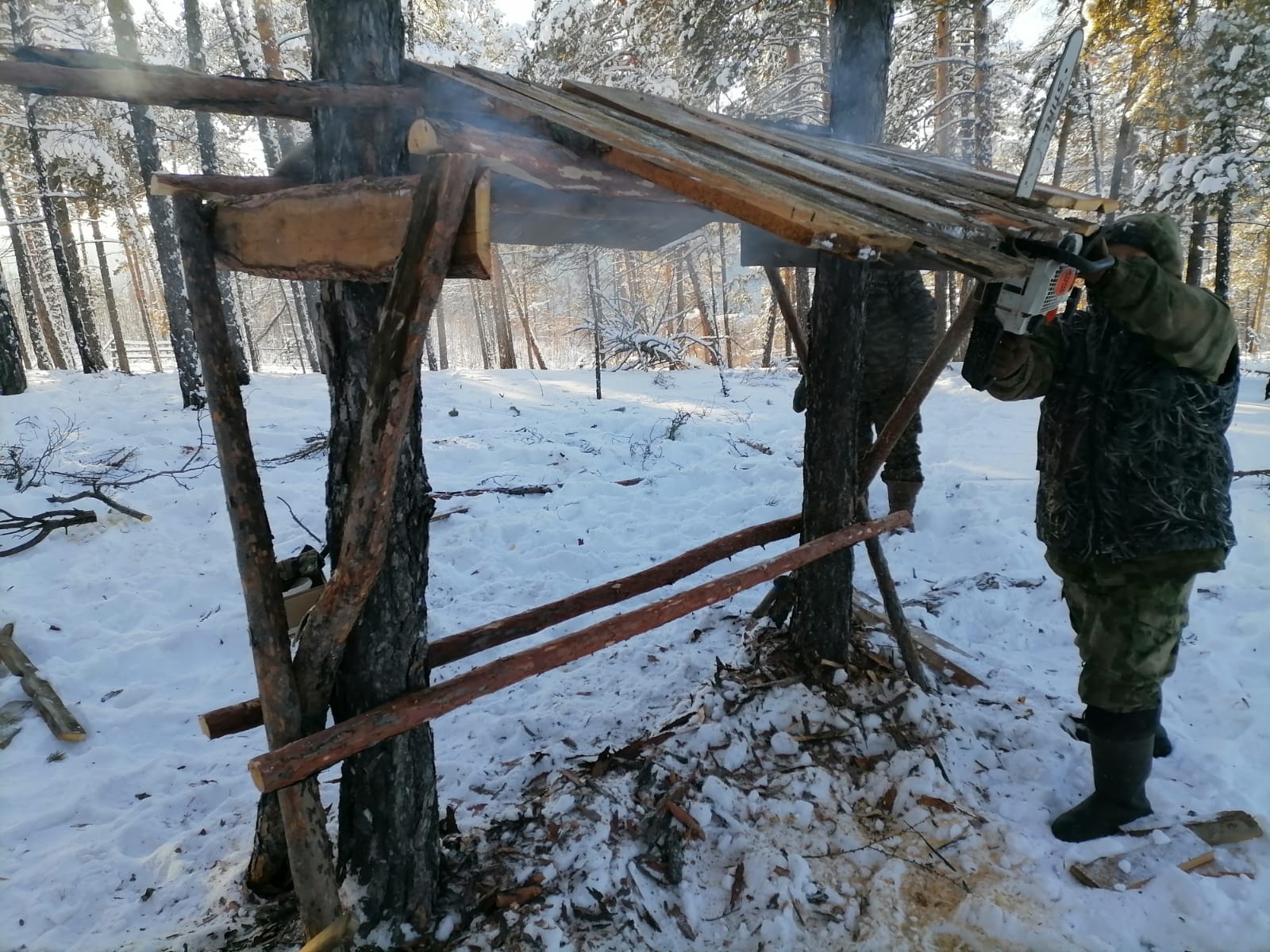 По-весеннему ясный и солнечный день прошел в работе, мужчины изготовили кормушку на урочище, где заметили свежие следы животных. В качестве гостинцев для косуль и других копытных наполнили изготовленную кормушку тальниковыми вениками и сеном.