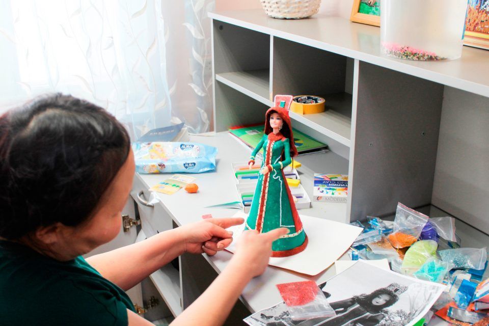 Осваивая пластилинографию, они создают лепные творения с изображением выпуклых объемов на поверхности и используя комбинированные техники. Одной из последних работ стало платье в национальном стиле из пластилина для куклы, декорированное бисером.