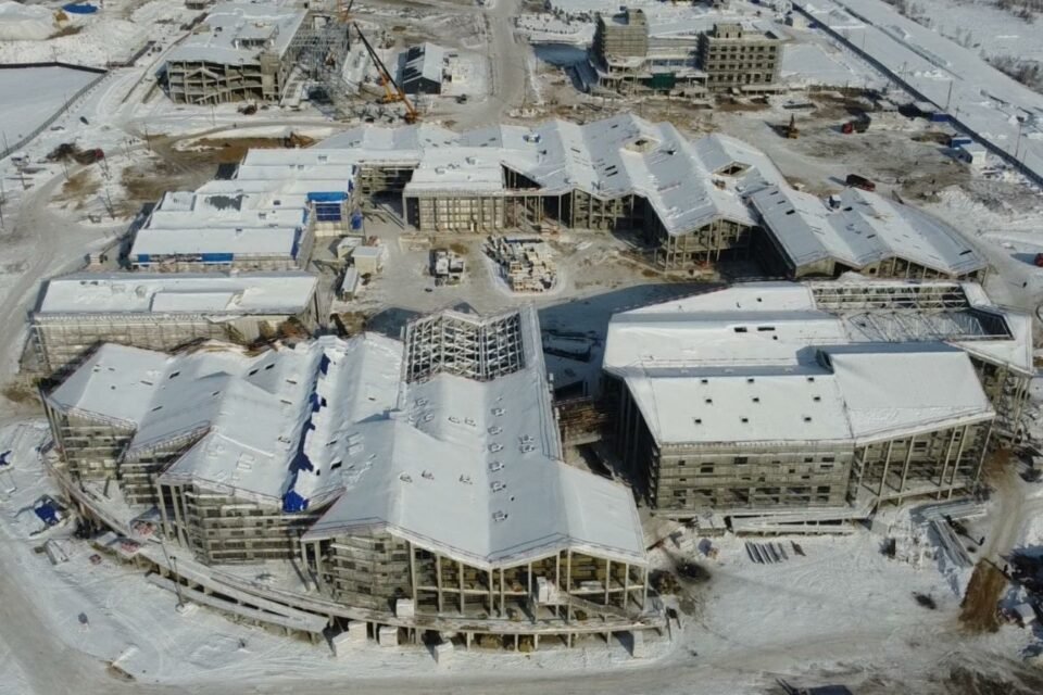 На данный момент завершены монолитные работы по возведению каркасов всех школьных корпусов, жилого дома и транспортного терминала. Также была смонтирована постоянная котельная и все необходимое для отопления оборудование, установлен резервуар противопожарного запаса объемом 160 куб. метров.