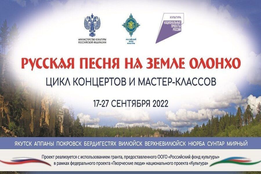Творческий проект «Русская песня на земле Олонхо» представят с 17 по 27 сентября в девяти городах и поселках республики: Якутске, Аппанах, Покровске, Бердигестяхе, Вилюйске, Верхневилюйске, Нюрбе, Сунтаре и Мирном. Прозвучат романсы, аутентичные народные, современные авторские, сольные и хоровые произведения.