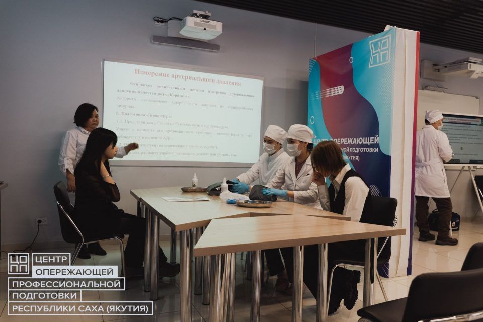 Якутский медицинский колледж проводит пробу по одной из самых популярных профессий «Фельдшер». Школьники учатся измерять артериальное давление, оказывать базовую первую помощь по сердечно-легочной реанимации и в хирургии в интерактивном формате.