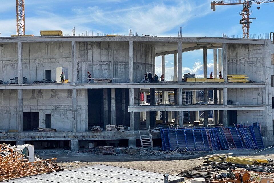 После установления положительных температур строители приступили к мониторингу конструкций после первого зимнего сезона, ведут работы по подготовке опалубки и изготовлению армированных каркасов здания, техническому обслуживанию спецтехники после зимы. Планируется к концу текущего года закрыть тепловой контур здания — это позволит не останавливать строительные работы на объекте и зимой.