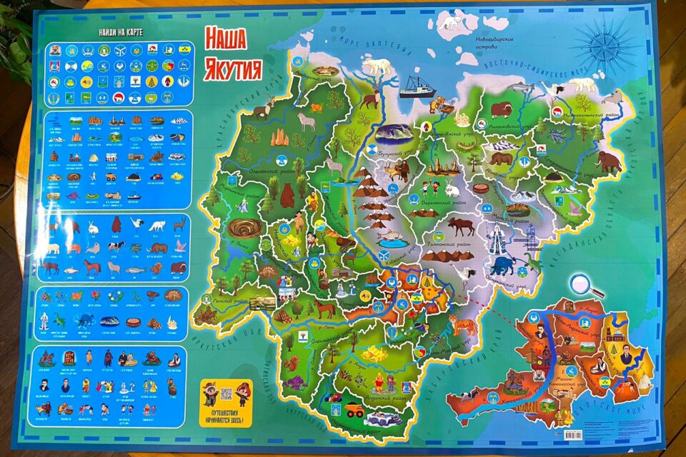 Национальное издательство «Айар» выпустило красочную настенную карту республики для детей. На ней собраны самые интересные факты о каждом районе региона, ярко иллюстрированные символами природы, животного мира, народной культуры и традиций.