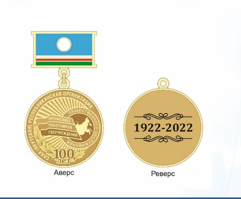 Нагрудный знак изготавливается из латуни и имеет форму правильного круга диаметром 35 мм. На лицевой стороне (аверсе) знака в центре изображен логотип Общероссийского Профсоюза работников государственных учреждений и общественного обслуживания РФ. Ниже по центру находится надпись «100 лет». По окружности размещена надпись «Саха (Якутская) республиканская организация)». На оборотной стороне (реверсе) медали в центре размещена надпись «1922-2022). Все надписи и изображения на знаке выпуклые. Знак при помощи ушка и кольца соединяется с прямоугольной колодкой, эмалевым покрытием с изображением флага Якутии.