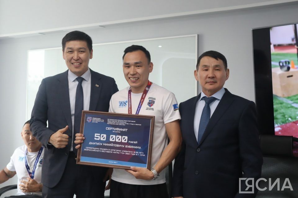 В ходе пресс-конференции за вклад в развитие физической культуры и спорта в Якутии, за организацию и популяризацию в регионе комплекса многоборья «Готов к труду и обороне» благодарственным письмом и сертификатом на сумму 100 тысяч рублей наградили исполнительного директора федерации многоборья ГТО, победителя в номинации «Профессионалы» Игнатия Чомчоева и победителя в категории «Любители 40+» Леонида Зырянова. Такую же благодарность и сертификаты на сумму 50 тысяч рублей вручили серебряному призёру в категории «Профессионалы» Александре Барашковой и серебряному призёру в категории «Любители 18+» Дьулусу Бубякину.