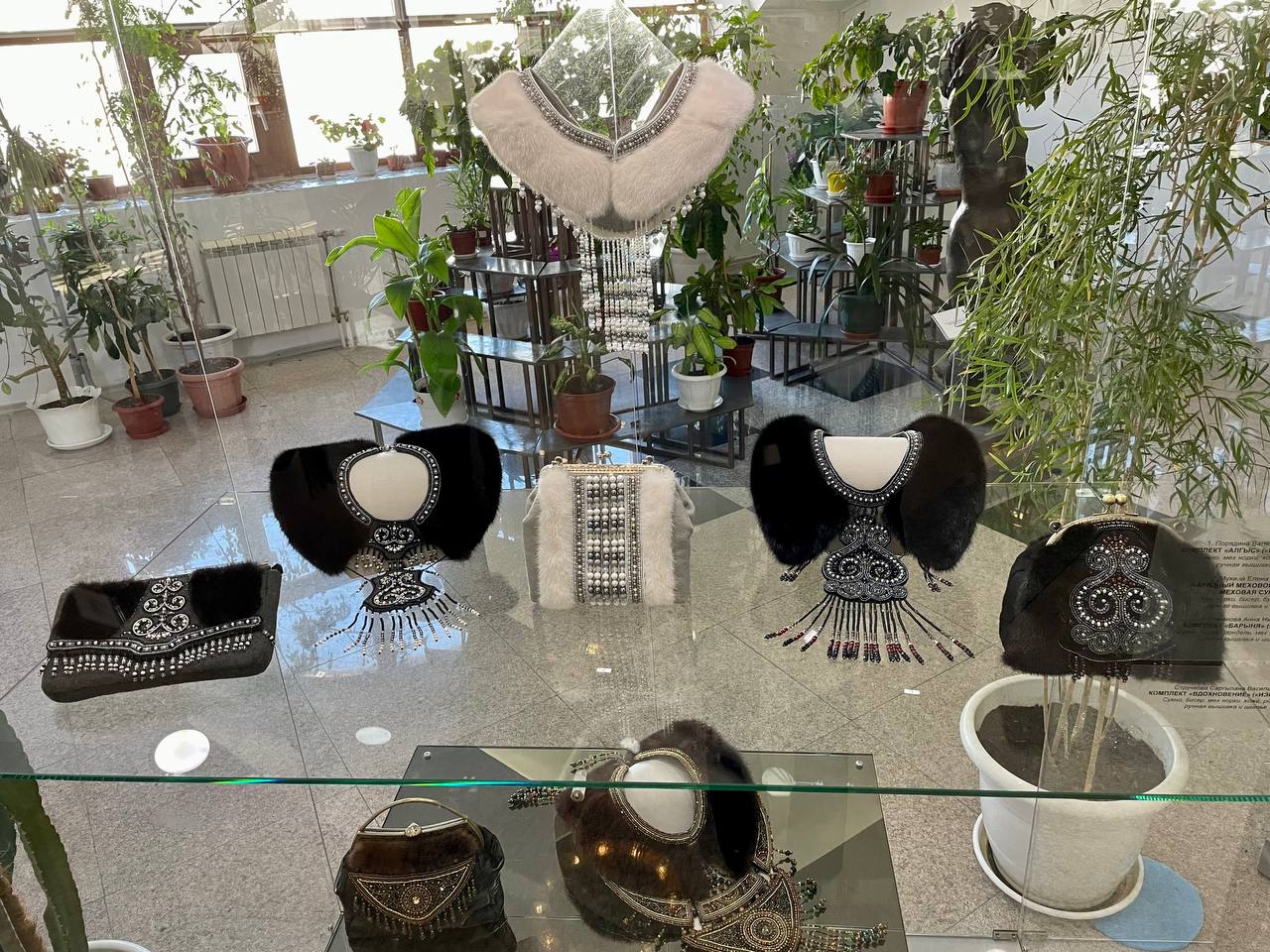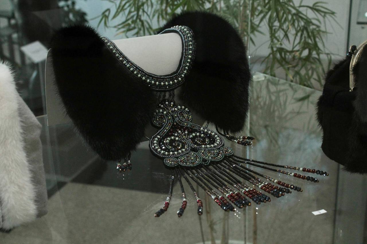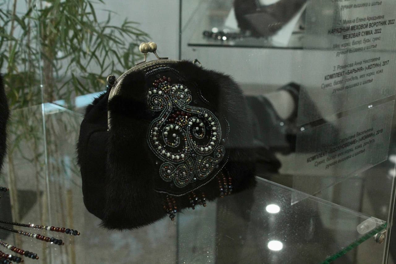В экспозиции представлены женские нарядные комплекты с вышивкой, сумки, кошельки из меха норки и воротники ручной работы. Народный мастер республики Людмила Жиркова в своих работах выделила самобытный национальный характер, а также адаптировала традиционный стиль к современному.