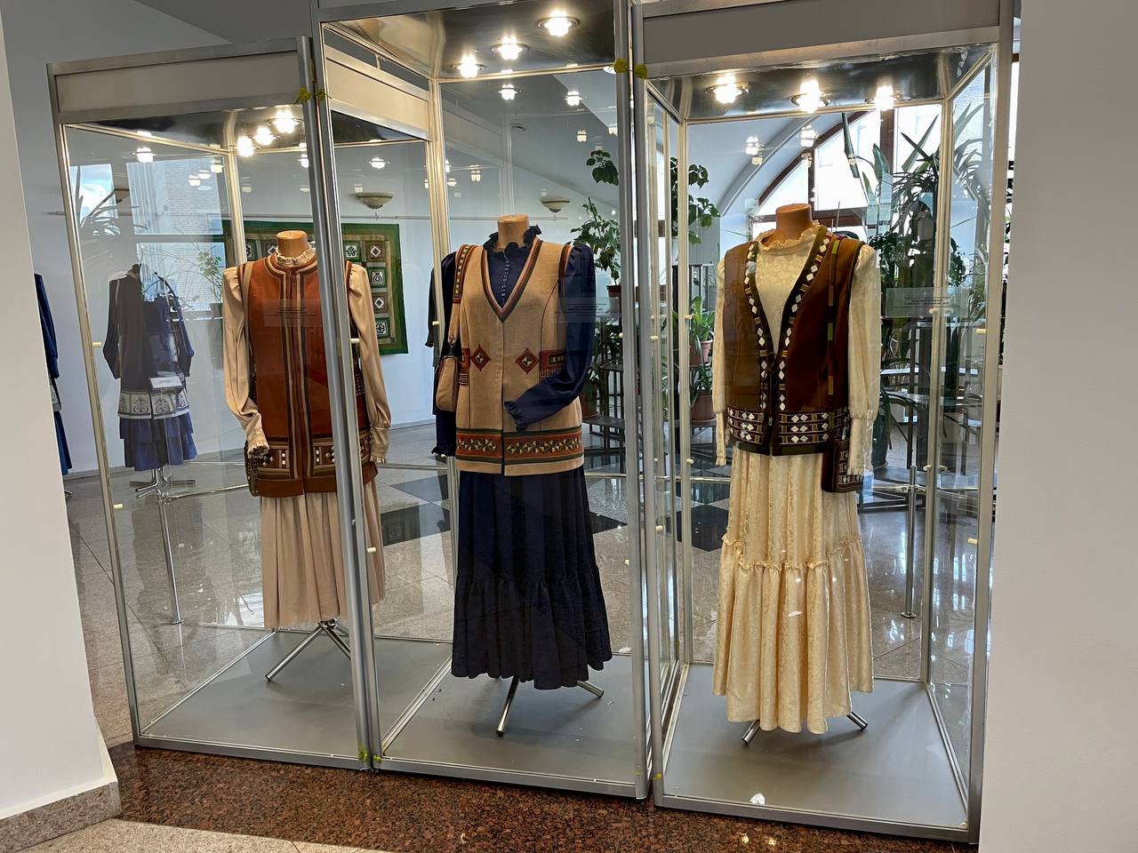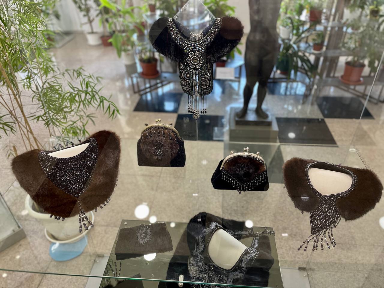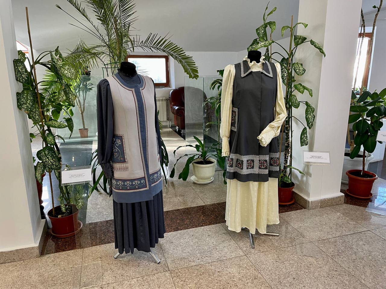 В экспозиции представлены женские нарядные комплекты с вышивкой, сумки, кошельки из меха норки и воротники ручной работы. Народный мастер республики Людмила Жиркова в своих работах выделила самобытный национальный характер, а также адаптировала традиционный стиль к современному.