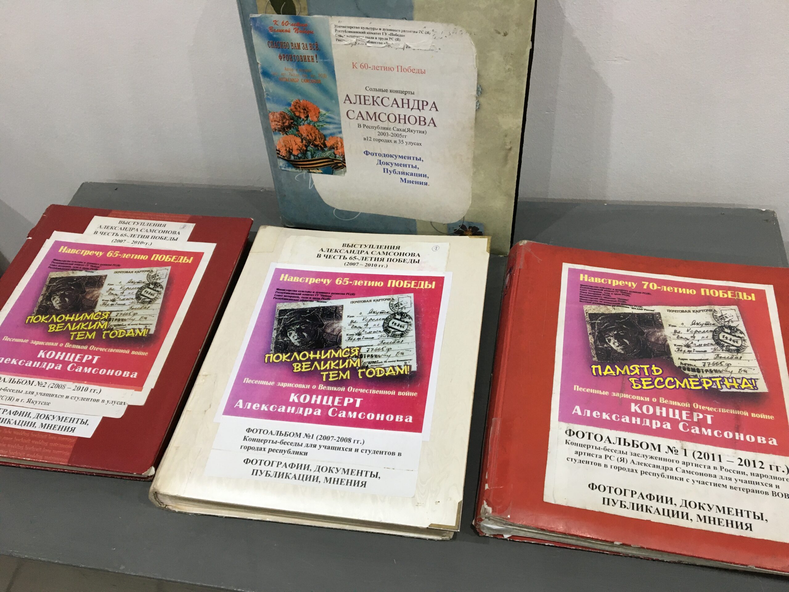 Творчество Александра Самсонова неразрывно связано с 9 Мая. Основные экспонаты выставки ㅡ рукописные альбомы, сделанные самим артистом в честь юбилейных дат Победы в Великой Отечественной войне. Фотографии собраны лично Александром Парфеньевичем и любовно склеены в восемь фотоальбомов.