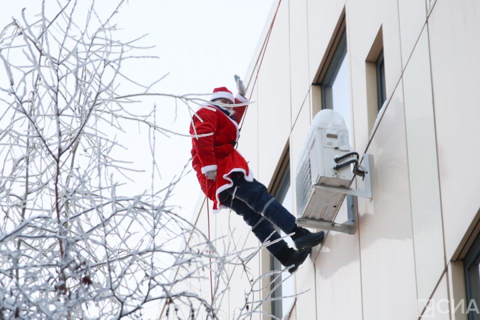 В Педиатрическом центре НЦМ — РБ № 1 прошла всероссийская благотворительная акция «Десант Дедов Морозов». В рамках мероприятия, организованного уполномоченным по правам ребенка в Якутии и Региональным центром по реализации федерального проекта «Навигаторы детства», спасатель, облаченный в костюм Деда Мороза, спустился с крыши медицинского учреждения с помощью альпинистского оборудования.