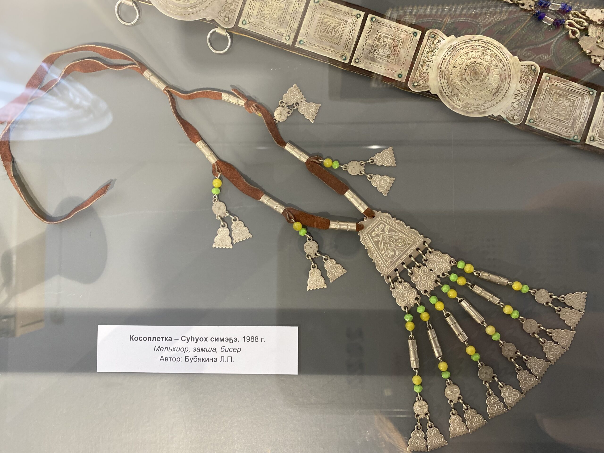 Особое место занимают разнообразные по форме, оформлению и технике исполнения серебряные украшения и изделия: шейно-нагрудные (гривны – кылдьыы, шейные браслеты – моой симэҕэ, нагрудные (илин кэлин кэбиһэр), набедренные (наборные пояса, подвески – өттүк симэҕэ), украшения для рук (браслеты, кольца), серьги, предметы кумысопития, символы якутской национальной культуры – чорооны с различными орнаментальными узорами, нарядное убранство верхового коня, изделия известных народных мастеров Якутии: хомус, якутские ножи, изделия из бивня мамонта и другие уникальные экспонаты из фондов Якутского музея им. Ем. Ярославского.