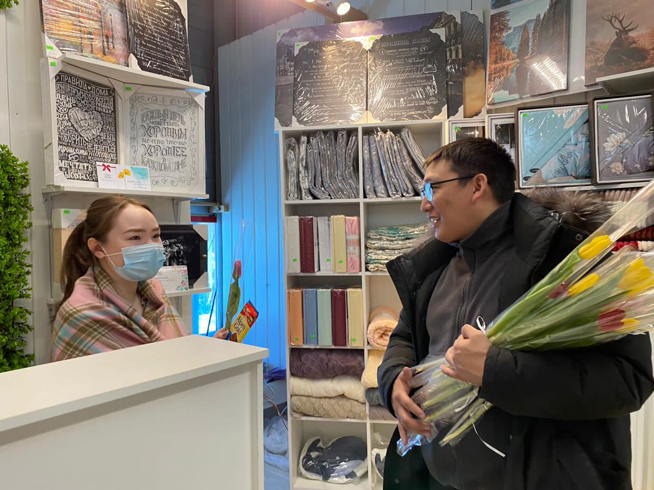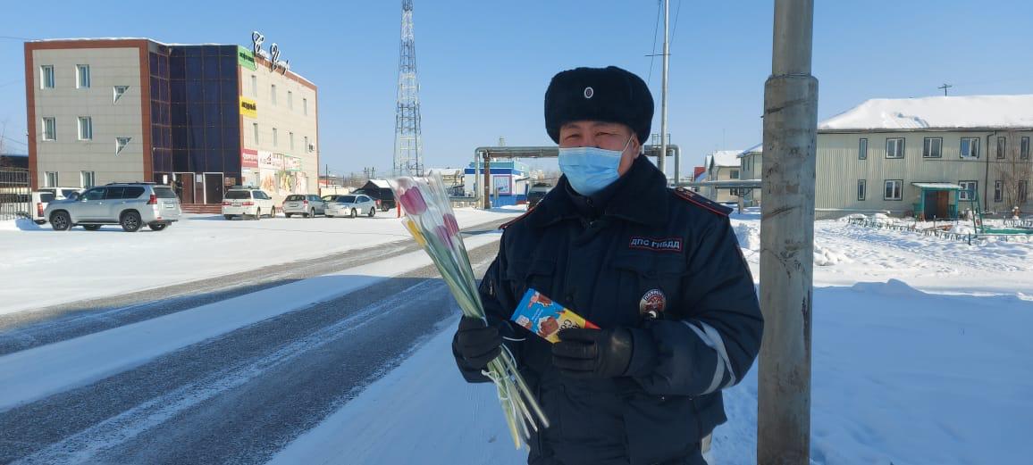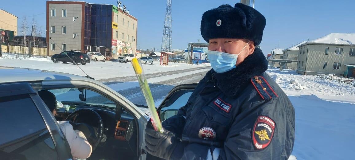 Они подарили женщинам, работающим в этот день в магазинах и на рынках, живые цветы. К весенней акции присоединились и сотрудники ГАИ, поздравив женщин-водителей на улицах города.
