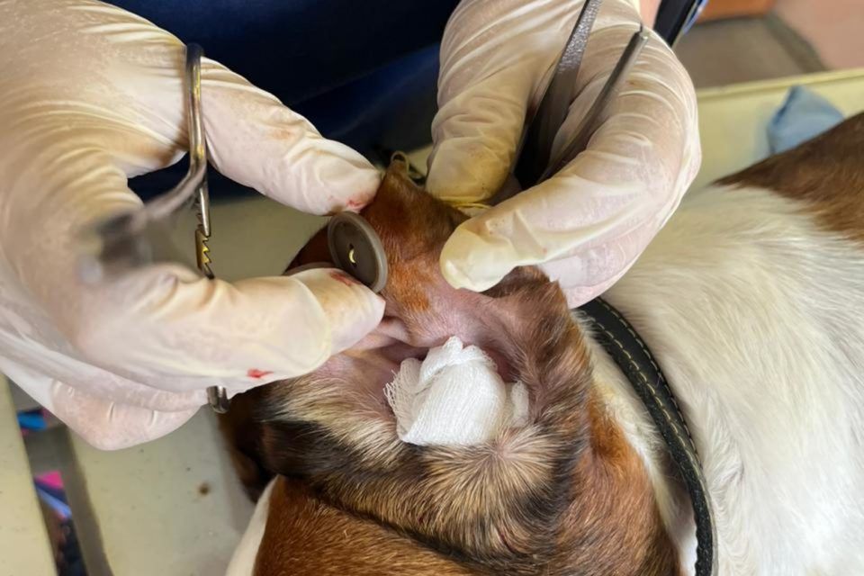 Вдоль уха собаки ветеринары сделали надрез и удалили скопившуюся жидкость. Потом пришили пуговицы, чтобы дать срастись хрящу и коже.