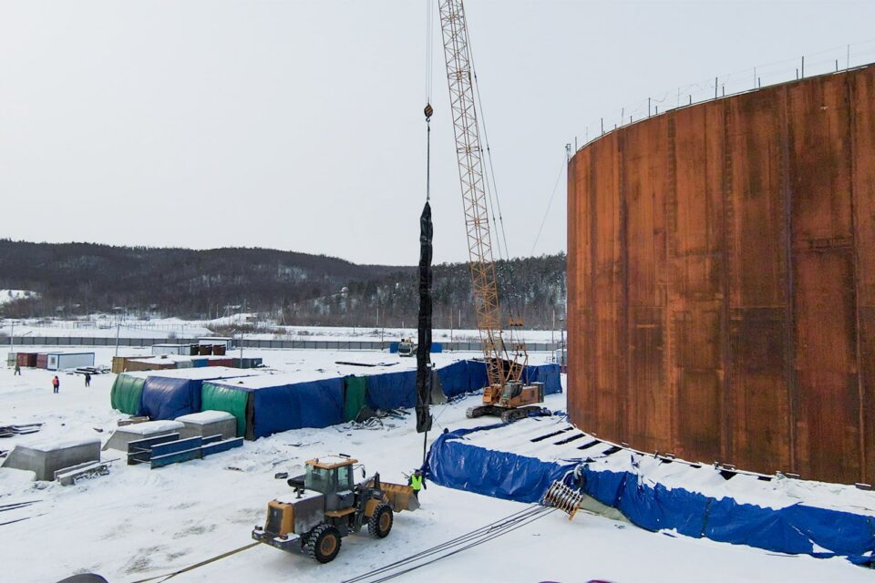 На строительной площадке мостового перехода через реку Лену в Якутии приступили к перемещению первого коффердама опоры № 10 ближе к руслу. Движение происходит только в светлое время суток.