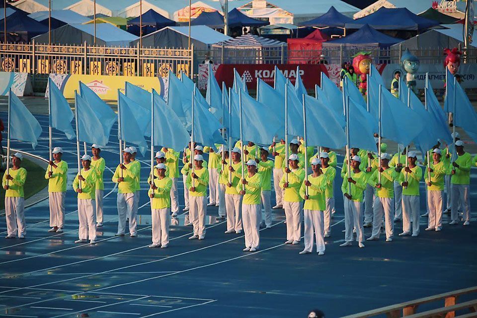 Под аплодисменты зрителей семеро спортсменов внесли на стадион официальный флаг соревнований. Чести поднять его были удостоены гроссмейстер, чемпион России и мира, серебряный призёр Кубка мира по шашкам Андрей Федотов, победитель VI спортивных игр Народов Якутии республики по волейболу Клавдия Павлова, мастер спорта международного класса Рекордсмен мира, победитель первенства Европы Александр Петров, мастер спорта международного класса, серебряный призёр чемпионата Европы, обладатель кубка России по стрельбе Евгения Тимофеева, мастер спорта международного класса, двукратная чемпионка России по легкой атлетике на дистанции 100 м Надежда Гоголева и кандидат в мастера спорта, чемпион России по легкой атлетике среди лиц с ПОДА Александр Парников.