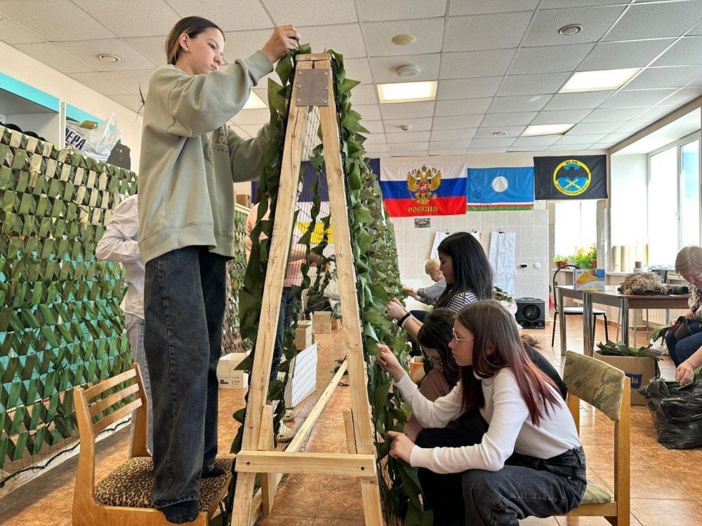 Юные волонтеры и советник директора школы помогли плести маскировочные сeти волонтерскому штабу Мирнинского района. Ребята научились вырезать полоски из специальной ткани и вплетать их по определённым схемам в маскировочную сеть. Своей работой они спасают жизни многих солдат, кроме защитных сетей ребята из средней школы№7 г. Мирного передали солдатам письма с тёплыми словами поддержки, а также обработанные консервные банки для окопных свечей.