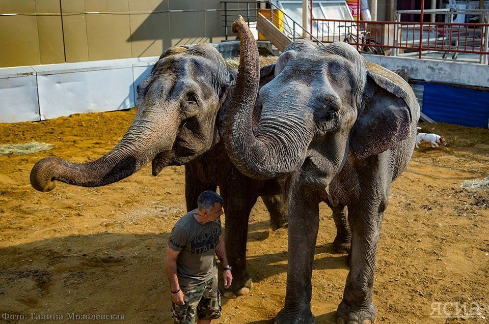 Давио Тони и две слонихи итальянского цирка«Дорогу мы все перенесли тяжелую, но все здоровы и хорошо себя чувствуют. К перевозке у нас самое пристальное внимание. Для нас животные как дети, которые нас еще и кормят, если с ними что-то случится, мы теряем работу. Бывают дрессировщики — садисты, как и родители-садисты. Мы с такими дело не имеем. Животные у нас содержатся на свободе. И надо понимать, что все животные с конюшни на манеж бегают сами, без ассистентов. Такой вот метод дрессуры, с персоналом мы отдельную работу проводим, они пугаются, что по цирку бегает бизон», — рассказывает Бондарчук.