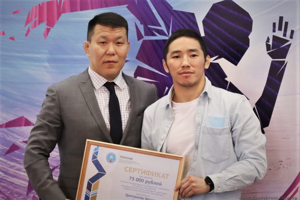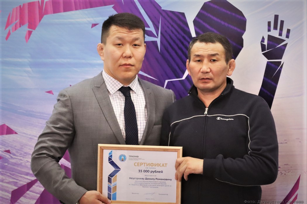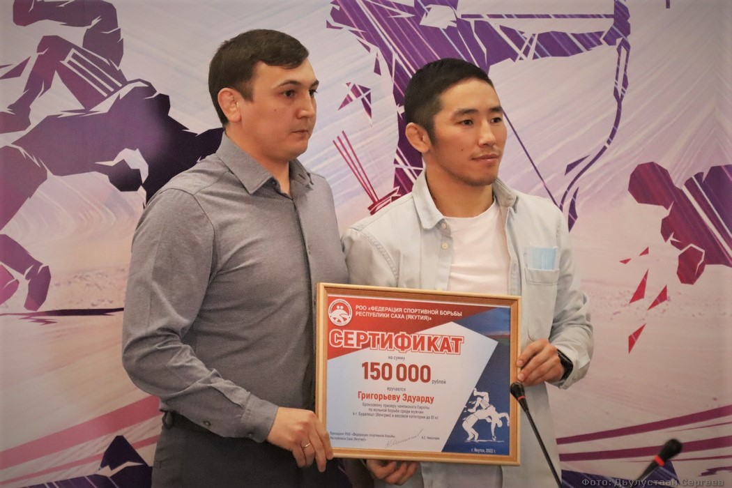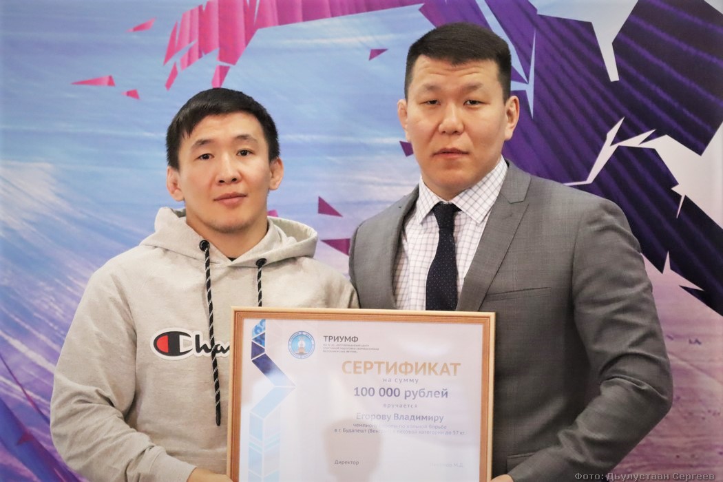 Чемпиону Европы Владимиру Егорову вручили сертификат на суммы 100 и 300 тысяч рублей, его тренеру Александру Сафронову — 50 и 75 тысяч, Эдуарду Григорьеву — 75 и 150 тысяч рублей, тренеру Данилу Неустроеву — 35 и 37,5 тысяч рублей.