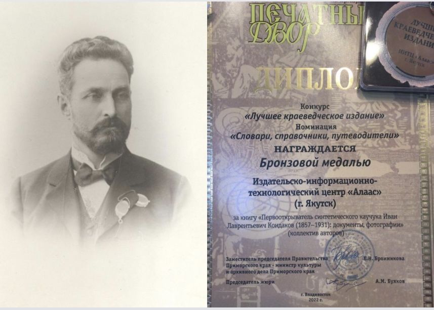 Медаль была вручена за научно-популярное издание, книгу-альбом «Первооткрыватель синтетического каучука Иван Лаврентьевич Кондаков (1857–1931): документы, фотографии».