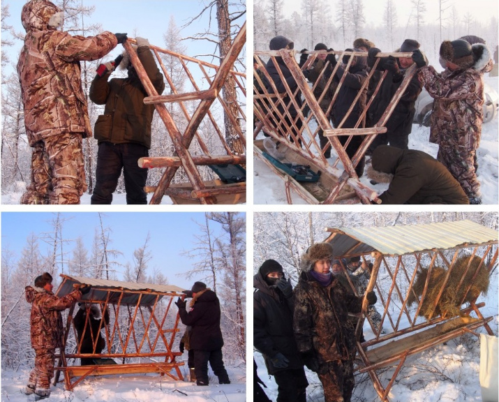 Акцию активистов общества поддержали педагоги и учащиеся 10 класса школы «Айыы Кыhата», а также их родители. С восходом солнца они выехали в лесную местность, где многочисленные следы косуль, зайцев и куропаток показали, что жизнь в лесу кипит. Выбрав наиболее подходящий участок на охраняемой территории, мужчины команды под руководством мастера в считанные минуты построили две кормушки. После этого школьники наполнили их кормом: сеном, кукурузной мукой, овсом и специальной кормовой солью для животных.