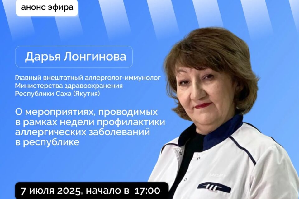 Главный внештатный аллерголог-иммунолог министерства здравоохранения Якутии Дарья Лонгинова 7 июля проведет прямой эфир в социальных сетях «ВКонтакте» и «Одноклассники». Об этом сообщает пресс-служба главы и правительства республики.